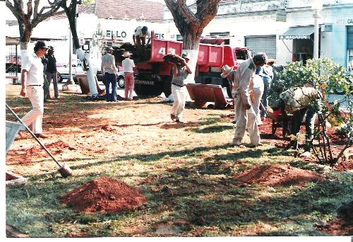 Vendo-se a praça Rui Barbosa no estado em que hoje se encontra, aliás, há mais de um ano, chega a dar saudades dos tempos em que a Prefeitura dela cuidava como um verdadeiro cartão de visitas da cidade. Esta foto é do início dos anos 90, em que funcionários da Prefeitura desenvolvem obras no sentido de recuperar a praça. Recuperar sem todavia mudá-la. Nos dias atuais a praça está descaracterizada e um pedaço da história de Jacarezinho éncontra-se comprometido. A desativação do chafariz e a construção de um sanitário que causa verdadeira poluição visual, faz com que os saudosistas e aqueles que entendem que a história precisa ser preservada, mais ainda pelo Poder Público, fiquem indignados com a atual situação, embora existam promessas de breve recuperação. Mas o que se destroi (como o chafariz) dificilmente poderá voltar a ser o que era.