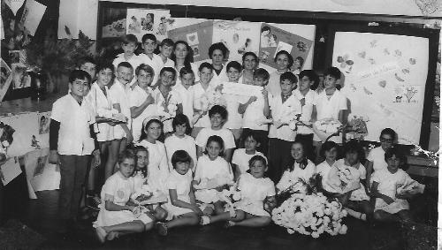 Na década de 60, possivelmente prestes a encerrar o ano letivo, alunos da quarta série do Colégio Rui Barbosa reunem-se com a Diretora Jandira Corrêa e as professoras, Selma Camargo Foggiato, Miriam Miguel e Maria Lourdes (da direita para a esquerda, na última fila). Acervo: Selma Camargo Foggiato.