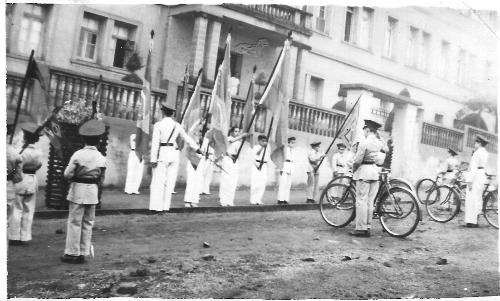 Esta é uma imagem interessante. O Colégio Cristo Rei organizava todos os sábados, defronte seu estabelecimento com todos os alunos perfilados, a execução do Hino Nacional. Esta formação que se vê na foto deve ter sido em um dia de gala, quando os alunos, em seu traje de desfile, ficavam defronte o colégio. Mas o curioso da foto é que alguns alunos trajavam o primeiro uniforme do colégio, branco (à direita da foto). À esquerda, os alunos já com o novo traje, cáqui. Devia ser uma fase intermediária entre um e outro, entre 1940 e 1942.