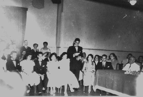Tendo como local os salões antigos do Jacarezinho Clube, no dia 06 de dezembro de 1953 os alunos do Curso Ginasial do Colégio Estadual Rui Barbosa realizam a sua formatura. Com o discurso do orador da turma, Elmo Ferreira, a mesa diretora atenta ouve suas palavras. Ao seu lado, da esquerda para a direita, a Profª Nadir Infante, o Prof. Octávio Mazziotti e o Prefeito Benedito Moreira, de branco (Acervo, Elmo Ferreira).