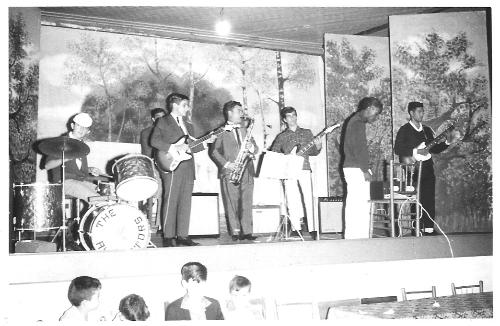 Comandada principalmente pelo professor Rodrigo Octávio Torres Pereira, então diretor do Colégio Estadual Rui Barbosa, a banda The Alligators se apresenta no palco do pavilhão por volta dos anos 50. Na foto, além do prof. Rodrigo, também o futuro e grande maestro e também poeta Paulo Braga Diniz e o crooner Rubens Adão Gomes preparando-se para cantar.