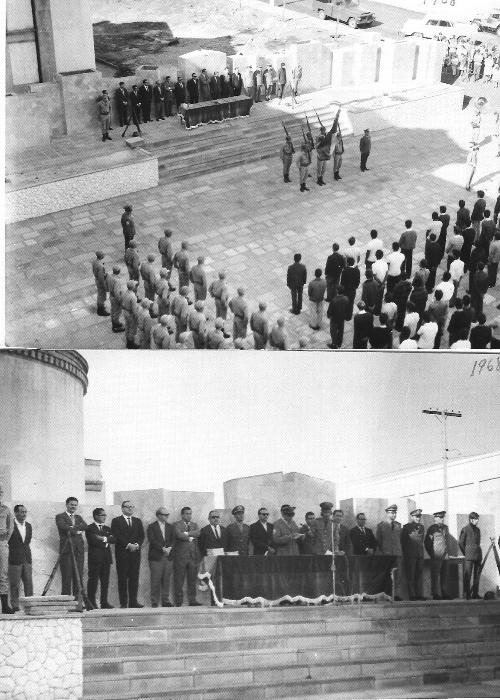 Em comemoração ao Dia do Reservista no ano de 1968, autoridades civis e militares reunem-se na antiga praça Dr. João Rodrigues Caldas, que se localizava na mesma quadra da Catedral Diocesana. A praça foi desativada há já muitos anos, até porque era propriedade particular, mas o que se lamentou e que fossem demolidos também o belo mural ornamental que ali existia e que serviu em inúmeras oportunidades de palco para solenidades cívicas, como esta da foto.