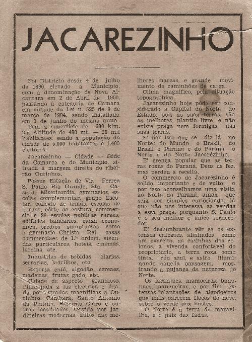 Na contra-capa do álbum de que trata a página anterior, havia uma divulgação estatística sobre a cidade de Jacarezinho. O jacarezinhense era muito bairrista e corria mundo então as frases que surgiram aqui e que consta nesta propaganda: "É por isso que se dia lá no Norte: do mundo, o Brasil; do Brasil, o Paraná. do Paraná, o Norte; e do Norte, Jacarezinho.