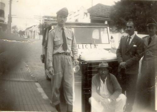 Esta imagem é do início dos anos sessenta, feita defronte à Delegacia de Polícia de Jacarezinho e mostra dois policiais civis muito queridos em Jacarezinho (agachado, Sebastião Adão Gomes, "Tiãozinho"); em pé, de terno, Américo Chardula). E ainda dois PMs, um dos quais também estimado demais na cidade, Ataliba Barbosa, á direita, quase fora da imagem. O outro PM não foi identificado. Eram tempos de calmaria e tranquilidade em Jacarezinho. O jeep que se vê era a principal, talvez única, viatura da cidade... (Acervo; José César Rigo. Intermediação: Valmir Sóccio, Dr. Rogério Lopes e Vicente Estanislau Ribeiro, "Vicentinho").