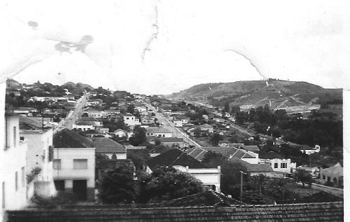 Esta foto foi feita a partir do prédio em que era a residência de Benedito Moreira, localizado defronte a praça Rui Barbosa, esquina com a Santos Dumont. A rua que se vê à esquerda é a Costa Júnior (ao alto, o Morro do cruzeiro) e a da direita é a D. Fernando Taddei. Imagem dos anos 50 que se bem observada vai se ver que muitas das casas que ali aparecem ou foram demolidas ou descaracterizadas por completo. Ainda havia muitos terrenos sem edificações. À direita vê-se ruas planejadas para o loteamento que ali se programara e que tinha o nome de Vila Esperança, de propriedade de Francisco César Batalha. Hoje naquele lugar encontra-se o Núcleo Residencial D. Pedro Filipak,