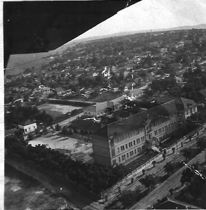 Feita de dentro de um aviãopor fotógrafo amador (é possível ver uma das asas do avião á esquerda) esta foto traz uma imagem de Jacarezinho provavelmentedo ano de 1948 aparecendo em primeiro plano o prédio do Colégio Cristo Rei ainda sem sua ala nova. A avenida Getúlio Vargas com árvores recém-plantadas nas calçadas. E a cidade ainda não desenvolvida do lado esquerdo da foto.