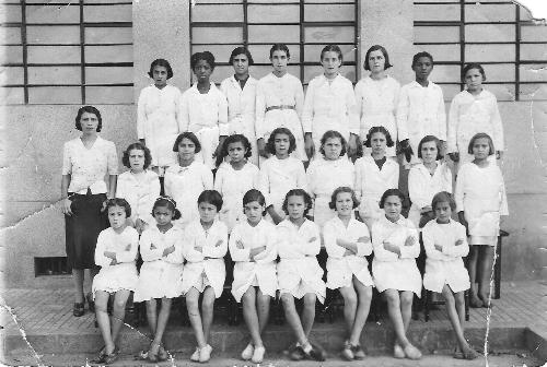 Houve um tempo em que o uniforme dos alunos das escolas estaduais do Paraná, principalmente os do chamado grupo escolar (1ª a 4ª série do então curso primário, hoje ensino fundamental) tinham como seu uniforme o chamado guarda-pó, uma vestimenta que encobria a roupa normal. E assim eram eles identificados pelas ruas, ao irem e ao sairem das escolas. Esta foto retrata um grupo de alunos, ao que tudo indica no pátio do Colégio Rui Barbosa, na década de 40. A professora parece ser a dª Zilda Benedetti.