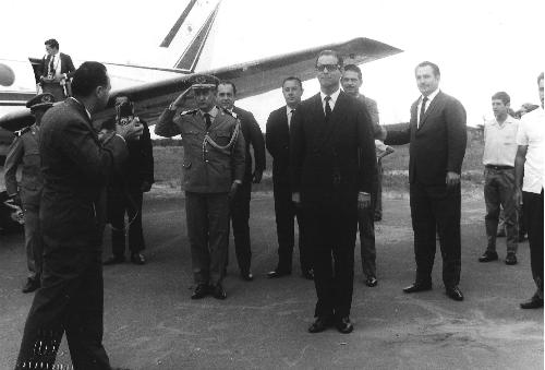 No aniversário da cidade, em 2 de abril de 1968, chega de avião o Governador Paulo Pimentel. Na época Jacarezinho tinha o Aeroporto José Afonso funcionando regularmente, com excelente pista asfaltada e que possibilitava o pouso e decolagem de aviões do Brasil inteiro e com isto era bastante facilitada a presença de autoridades em solenidades locais. Paulo Pimentel veio a Jacarezinho naquele dia onde participou de todos os eventos comemorativos do 68º aniversário de Jacarezinho. No aeroporto foi recebido por autoridades locais e com a execução do Hino nacional, pela Banda do 2º Batalhão, momento em foi fixada esta imagem. Logo atrás do Governador o então deputado estadual Wilson Figueiredo Fortes (recentemente falecido) filho de tradicionais famílias locais e que tem ao seu lado seu primo José Fortes (fal.). (Acervo, Família de José Fortes, intermediação por Vicente Estanislau Ribeiro, Vicentinho).