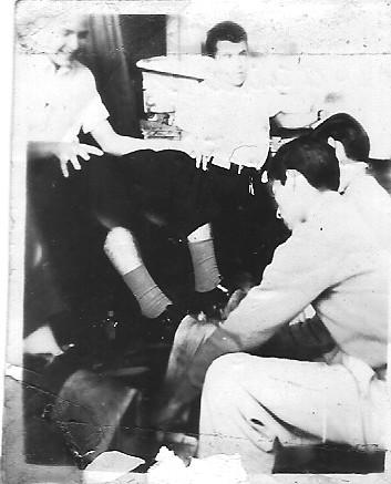 Até os anos 70 era comum as bancas de engraxates na cidade e duas delas ficaram famosas: a do salão Navarro e a da Agência Copacabana, de jornais e revistas. Esta foto é de 1º de setembro de 1957 e foi feita na Agência Copacabana, que ficava na rua Paraná, bem no centro, e que era de propriedade de João Batista de Almeida Leite. Engraxando os sapatos José Carlos Piazza (Piazzinha, fal.) que tem ao seu lado Fonseca, gerente da Agência. Fingindo ser o engraxate, René Figueiredo (Giru - a quem pertence a foto). Esta imagem registra um dos belos momentos da história do centro de Jacarezinho. (Intermediação, Jorge Kalil).
