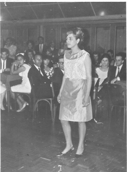 Esta foto data de meados dos anos sessenta, possivelmente de 1965, quando nos salões do Jacarezinho Clube procedia-se a eleição da Embaixatriz do Turismo daquele ano. Desfila a candidata Maria de Lourdes Pini (Uda - fal.) sob os olhares atentos da sociedade daquela entidade. (Acervo, Walter Dolens Rosa, Frangão).