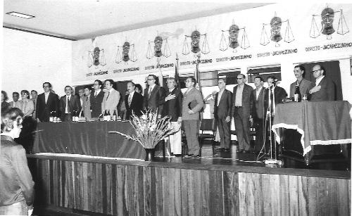 Os soldados de nosso país que integravam a Força Expedicionária Brasileira - FEB e que defenderam os aliados na 2ª Guarra Mundial eram carinhosamente chamados de "pracinhas". Jacarezinho enviou um contigente relativamente grande aos campos de batalha da Itália. Na praça Rui Barbosa existe um monumento homenageando todos eles com seus nomes ali gravados. A cidade tem também uma via pública com o nome de Rua dos Expedicionários. Foram formas de manifestação da gratidão de toda a nossa população áqueles bravos soldados que na Europa lutaram em favor da democracia. No dia 08 de maio de 1976, quando comemorava-se o 30º aniversário do término da 2ª Guerra Mundial, a Faculdade Estadual de Direito do Norte Pioneiro, da qual era eu seu diretor (ao centro, mais à esquerda, trajando terno claro) fez realizar uma Sessão Cívica Solene em homenagem aos nossos pracinhas. Registre-se que todos eles compareceram, naquela oportunidade. A cena acima é a do momento da execução do Hino Nacional Brasileiro, na abertura da solenidade.