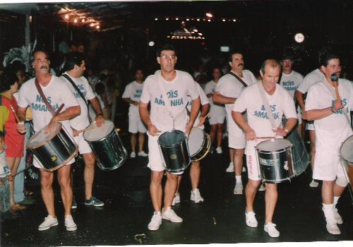 Dr. Celso, na verdade, neste desfile, os blocos desfilaram intercalando com as escolas de samba, para dar tempo de o carro de som (com os puxadores de samba) atender a todas as escolas. Este grupo desfilou para animar a terceira idade do SESC, pois estavam órfãos da escola de samba Humildes da Favela, que não desfilou. Consigo identificar: Miguelão Saad, Carlos Eduardo, João Ribeiro, Florindo, Girafa e Laurinho