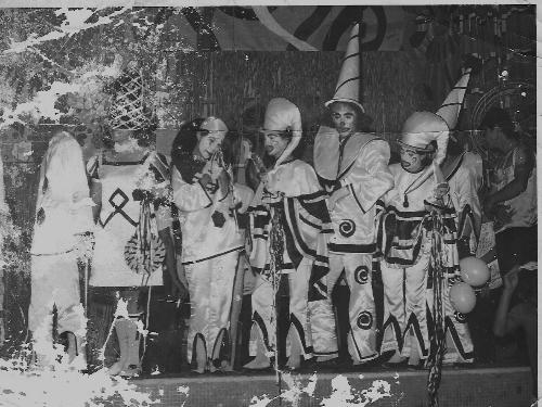 Tudo era motivo para criar um tema ao bloco que se organizava. Aqui o motivo escolhido foi o dos chineses, provavelmente porque o carnaval daquele ano devia ter alguma música falando coisas da China. Seus integrantes desfilam no palco para apreciação dos jurados que escolheriam o mais bonito bloco do ano, no canaval do Jacarezinho Clube. Foto dos anos 60. (Acervo e texto: Celso Antônio Rossi. - Expressamente proibida a reprodução sem mencionar a fonte e dar o endereço: jacarezinho.nafoto.net). -