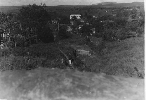 Vindo da direção do prédio do SAIC (onde hoje funciona o Instituto Ambiental do Paraná - IAP) o homem caminha por uma trilha, com seu traje domingueiro, certamente em direção à sua residência que deveria ficar pelas imediações. À esquerda mais tarde surgiria a Vila Rosa, embora as primeiras casas ali já existissem mas ainda não era considerada um bairro. A foto é do final dos anos 40 (Acervo e texto: Celso Antônio Rossi - Expressamente proibida a reprodução sem mencionar a fonte e dar o endereço: jacarezinho.nafoto.net).