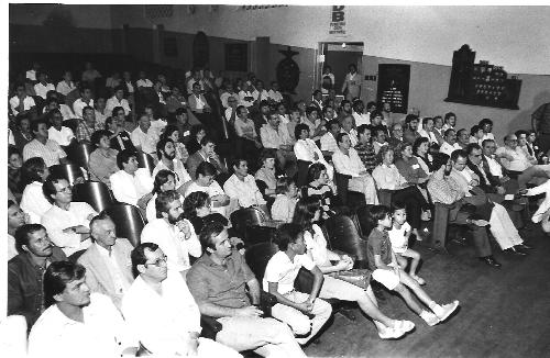 Políticos de toda a região reunem-se no Salão Nobre do Colégio Cristo Rei para deliberar sobre caminhos a serem seguidos pelo seu partido. Chama a atenção os quadros afixados na parede à direita e que se constituem em lembranças feitas pelos graduandos do curso ginasial dos anos 40 (curso ginasial, equivalente hoje ao ensino fundamental) e que os deixavam no colégio para exposição. E isto foi o que a direção do estabelecimento fez no início dos anos 80. O Salão Nobre, inaugurado em 1953 com a colação de grau da 1ª turma do Curso Cientifico (equivalente hoje ao ensino médio) ainda hoje existe e se encontra em excelente estado de conservação. As cadeiras são daquela época e de fabricação de Moveis Cymo, da cidade de Rio Negrinho, SC e também estão em ótimo estado, até porque os móveis daquela fábrica eram feitos para durar a vida toda. (Acervo e texto: Celso Antônio Rossi. - Expressamente proibida a reprodução sem mencionar a fonte e dar o endereço: jacarezinho.nafoto.net). -