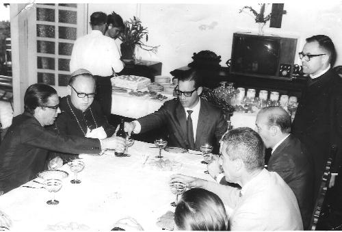 02 de abril de 1968. Jacarezinho comemora festivamente seu 68º aniversário de elevação a município com a presença do Governador Paulo Pimentel (de óculos, na cabeceira da mesa). À tarde, depois do desfile e do almoço, personalidades reunem-se com o Governador no Palácio Episcopal para um lanche rápido. Da esquerda para a direita, o Deputado Estadual Haroldo Bianchi (fal.) serve uma água ao governador sob o olhar atento do Bispo D. Pedro Filipak (fal.). À direita, em pé, o Padre Aparecido Stau que tem ao seu lado o Prefeito Francisco Cersósimo (fal.) e o presidente da Câmara Itamar Serra (fal.).