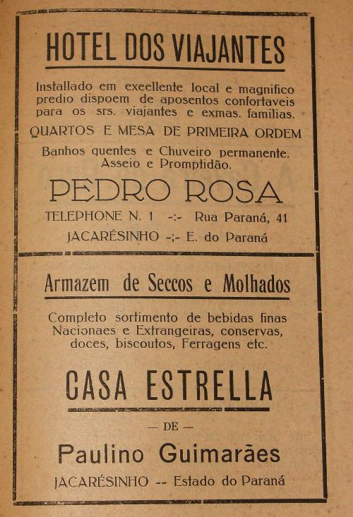 Primeiro hotel que se tem notícia em Jacarezinho, o Hotel dos Viajantes desde os primeiros anos do século XX funcionou na esquina da Paraná com a Coronel Baptista, onde hoje encontra instalado o Bar da Skina. Inicialmente de propriedade de Pedro Rosa era o único hotel da cidade até quando surgiu o Avenida e o Paulista. Esta propaganda encontra-se no Almanach dos Municípios, editado em Curitiba de 1928, e que tinha como editor Alberico Figueira. E ela foi extraída do site "subsídios para a historia de Jacarezinho" com endereço www.hist.jacarezinho.nafoto.net, de responsabilidade de Valmir Sócio. Jacarezinho à época se escrevia com "s" e acento agudo. Da Casa Estrela não se tem notícias ou informação.