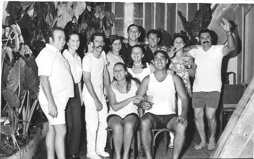 Ao que parece esta foto foi feita no carnaval. O ano era o de 1959 e o local, claro, só poderia ser mesmo o Jacarezinho Clube vivendo seus anos dourados. Nem todos foram identificados e nossos visitantes eventualmente podem colaborar conosco. Sentados, Maria Tereza e Aureomar Peixoto (Biguá). Ela em 1963 foi eleita Miss Jacarezinho. Logo atrás deles, bem no centro, Mara Bertozzi, irmã de Maria Tereza. Os demais, em pé, da esquerda para a direita: Paulo do Carmo (Paulo Paca - fal.); ???; Reimar Trioschi (Bacurau - fal.); ???; Xu Ayub (fal.); Orivaldes de Oliveira (Vardeco); Suely Cher (com o pandeiro na mão) e Jorge Assis (fal.).