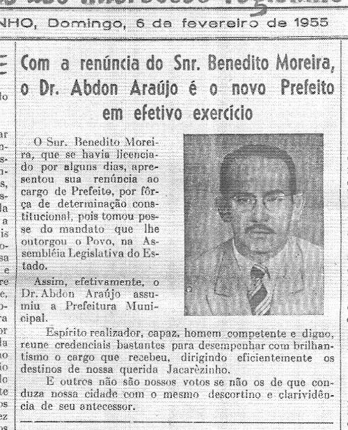 1955. Jacarezinho acabara de eleger como Deputado Estadual o Prefeito Benedito Moreira, grande líder político da história desta cidade. Ele se encontrava em meio ao seu mandato como prefeito e por isso teve que renunciar. Jacarezinho, como as demais cidades brasileiras, ainda não tinha o cargo de vice-prefeito, por isso quem assumiu foi o Presidente da Câmara, o médico Dr. Abdon Augusto de Araújo, que exerceu então o chamado "mandato-tampão" até a posse do sucessor, Cássio Arantes Pereira, em 1956. A imagem não é de boa qualidade porque reproduzida de um jornal da época, o "Jacarezinho", edição de 5 de fevereiro de 1955 mas vale para registrar a situação única da história de Jacarezinho (depois do Estado Novo) de um Prefeito renunciar ao mandato e de um Presidente da Câmara assumir em seu lugar.