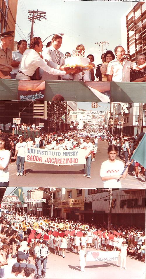 Festivamente comemorado o 85º aniversário de Jacarezinho no dia 02 de abril de 1985 com o tradicional desfile realizado principalmente pela rua Paraná. Na imagem acima o então Prefeito Emmanuel Gonçalves Vieira no momento em que acabara de receber da APAE o bolo comemorativo do aniversário, tendo à esquerda o radialista Armando Cavazzani ajudando-o e à direita o também radialista J. Lúcio (fal.). Na foto do centro o Instituto Minski desfila tendo acabado de passar pelo palanque. E na inferior um flagrante bonito de corações e margaridas carregadas por alunos de um estabecimento de ensino.