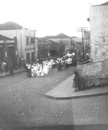 Participei dessa procissão ,vou enviar pelo correio a foto ampliada,essa freira é a Irmã Ines(fal) e me lembro da minha tia avó(Ide Alcantara Figueiredo) confeccionando nossas "asas de anjo',com penas de ganso,e as nossas "auréolas" eram feitas pela senhora(fal)Dita "folheira",que morava atras do Colegio Imaculada.Nessa procissão estavamos indo receber a imagem de Nossa Senhora de Fatima,pelegrina diretamente de Portugal,pelas regiões do Brasil,na estação ferroviária.Em maio de 1952.Obrigado pelas boas lembranças da minha cidade.