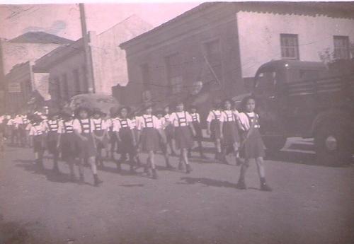 Em foto do início dos anos 40 as alunas do Colégio Imaculada Conceição desfilam pela rua Paraná defronte ao local onde hoje se encontra instalada a Molini's Panificadora, onde se situava a residência do Dr. Antônio de Almeida. A característica desta foto a ser observada é que as meninas portam seu chapéu estilo francês e que compunha o traje de gala do colégio.
