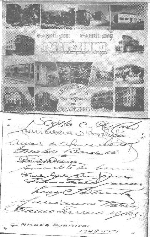 Extraída do jornal "!Hora H", edição de 31 de maio de 2000, esta reprodução não é de boa qualidade mas vale pela sua importância. histórica. Trata-se de um documento único de quando Jacarezinho comemorou seu cinquetenário. O dedicado fotógrafo Mário Shimakawa prestou uma homenagem à cidade naquela importante data, montando um cartão-postal com fotos de alguns dos principais pontos de Jacarezinho. Esse cartão já foi publicado neste fotoblog mas sua repetição prende-se ao fato de que no verso dele constam as assinaturas de todos os vereadores da Câmara Municipal daquele ano, colhidas pelo dedicado pesquisador e historiador Thomaz Aimone. Os vereadores eram: Scylla César Peixoto, Aparício Severo Baptista, Anésio de Almeida Leite, Arnaldo Bardelli, Péricles Pereira, Anacleto do Carmo, Fuad Abu-Jamra, Sebastião Aguiar, Levy Taborda, Marciano de Barros e Octávio Ferreira Dias.