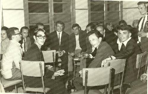 Identificados, da esquerda para a direita, a primeira Terezinha Diniz que tem ao seu lado Rui Camargo, seu marido e que faleceram em trágico acidente. Mais à frente, entre os dois, Paulo Fernandes da Silva (fal.). Ao lado do Rui, encoberto, Vicente Leão (fal.), Antônio Carlos Moraes, Américo Alves Pereira, um irmão do Juscelio e Caixinha. Com a mão na cadeira é Oswaldinhoi Vilela e os dois mais à frente são Arlindo Bessa Neto (de óculos) e Waldemar Tiessi (fal.). Em pé, Juraci de Oliveira (Jura).