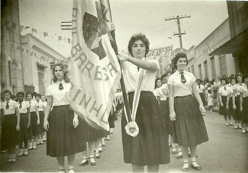 Pela rua Paraná (quadra que faz esquina com a rua Coronel Figueiredo) desfila no dia 07 de setembro de 1960 o Colégio Estadual Rui Barbosa, uma das mais tradicionais casas de ensino de Jacarezinho. À frente, portando a bandeira, Vera de Paula Almeida (fal.).