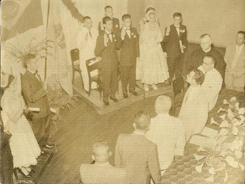 Esta foto registra o momento em que os técnicos em contabilidade da Escola Técnica de Comércio D. Fernando Taddei, turma de 1954, prestava seu juramento. Os integrantes da mesa voltaram-se em direção aos formando que em pé participavam daquele ato solene. Membros da mesa, da direita para a esquerda, o vereador Américo Figueiredo Moreira. o diretor da escola, Padre Damin; o Presidente da Câmara de Vereadores Dr. Abdon Araújo; o juiz de direito da Comarca, dr. Aran Machado; o Prefeito Benedito Moreira e o advogado, professor e paraninfo da turma, Arnaldo setti (os dois últimos de costas). Pela relação das autoridades percebe-se a importância que era dada a esse tipo de acontecimento. A cerimônia foi no salão nobre do Colégio Cristo Rei, a quem pertencia a escola.
