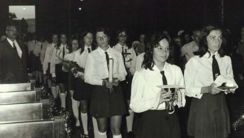 Parecem ser alunas do Imaculada. Ou seriam do Rui Barbosa? Elas estão entrando na Catedral de Jacarezinho para entregar ao celebrante da Missa que iria se realizar, em uma solenidade tradicional, os pertences da Missa: cálice, vela, ramos etc.
