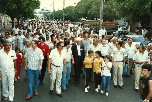 No dia 05 de outubro de 1985 o Colégio Cristo Rei -um dos educandários de maior tradição do país- completou o seu 50º aniversário com uma caminhada da qual participaram alunos e ex-alunos vindos de todos os pontos do pais. E dentre os "ex" encontrava-se o então Governador José Richa (pai do governador eleito Beto Richa). Mais de 1.200 pessoas desfilaram pelas ruas da cidade tendo à frente a magnífica fanfarra do estabelecimento. Dez anos depois o Colégio deixou de existir mas as raízes de seus alunos e a união entre eles perdurou. Desde a tarde de ontem, ex-alunos do Cristo Rei encontram-se mais uma vez reunidos para relembrar os bons tempos que aqui viveram. Esta imagem é de 05 de outubro de 1985, tendo ao centro o ex-diretor Padre Damian (de terno preto - fal.), à direita o então governador José Richa (fal.), o ex-diretor Padre José Walter (fal.), o prefeito de Andirá Alárico Abib, e o diretor nessa época Celso Rossi. À esquerda o dep. federal Santinho Furtado e o ex-deputado Valmor Giavarina (fal.).