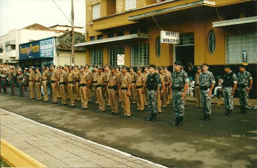 Nesta imagem policiais do 2º Batalhão perfilados para uma solenidade têm à sua direita atiradores do Tiro de Guerra e à esquerda a sua banda.
