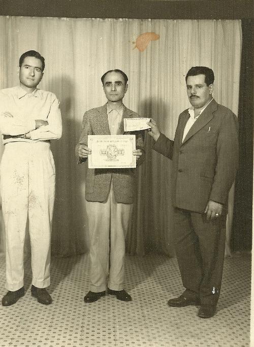Imagem de agosto de 1958. Os irmãos Jorge e Pedro Haddad, proprietários do antigo e tradicional estabelecimento comercial Casa Chic recebem um prêmio representado por um diploma e um cheque pela sua atuação no comércio local. Os dois irmãos, que durante muitos anos militaram na atividade comercial em Jacarezinho, sucedendo a seu pai, hoje já são falecidos.