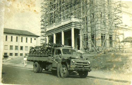 A foto é dos anos 50 e mostra a fase em que se encontravam as obras de construção da Catedral naquele tempo. O caminhão que se vê nela pertencia ao Bispado e auxiliava no transporte de materiais destinados à construção. A foto foi revelada ao contrário de maneira que o prédio que se vê à esquerda (Cristo Rei) deveria estar à direita...