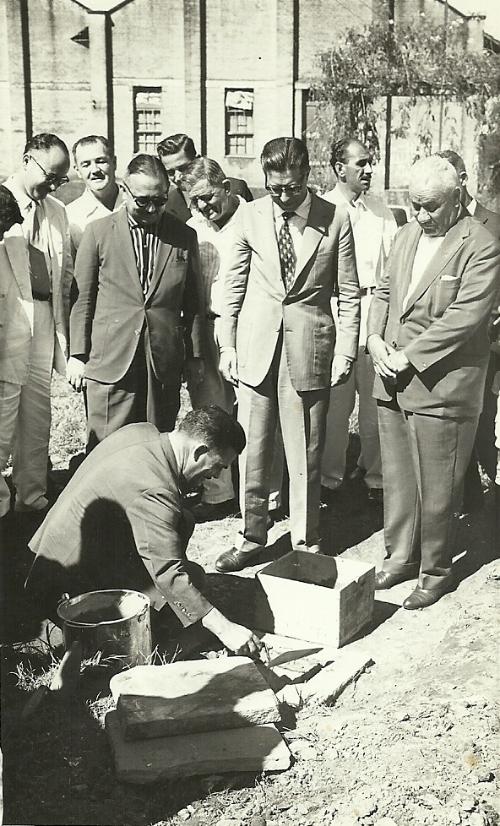 Não foi possível identificar o local mas a época desta foto varia entre 1960 e 1974 e registra a solenidade de colocação de uma pedra fundamental de algum prédio.
