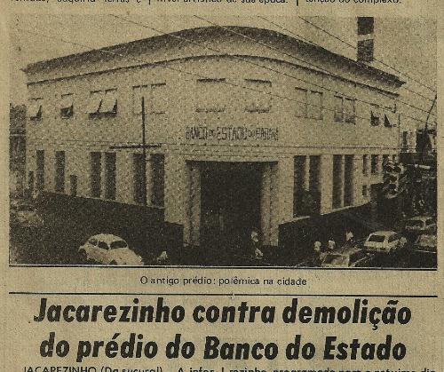 Construído em 1947 o prédio do Banestado era um dos mais bonitos do centro da cidade, constituindo-se mesmo em um magnífico monumento arquitetônico que retratava uma época de Jacarezinho. Quando a direção do banco decidiu pela sua demolição, com a construção em seu lugar de um novo e moderno (sic) a cidade procurou resistir, indo até à imprensa para manifestar seu desagrado. Mas foi tudo em vão, o edifício caiu, construiu-se um outro com uma arquitetura que nada tem a ver com a história da cidade e assim mais um pedaço da história de Jacarezinho foi para o chão. O jornal Folha de Londrina de 09 de março de 1980 publicou matéria sobre o descontentamento dos jacarezinhenses. A imagem acima é parte da matéria então divulgada.