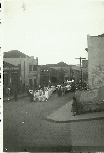 No mesmo local do qual foi publicada uma foto de um desfile, nos mesmos anos 50, esta imagem mostra a religiosidade da população de Jacarezinho em uma procissão. O prédio da Agência de Rendas (Coletoria Estadual) ainda não havia sido construído na esquina da direita em que se vê apenas um muro. O Bar Santo Antônio e a Farmácia Santa Terezinha, do farmacêutico Anésio de Almeida Leite ali já estavam.