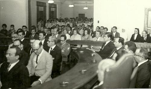 Foi, sem dúvida, posse de prefeito o que registra esta foto. Difícil dizer porém se foi a posse do dr. Nelson Gomes de Oliveira (o 1º, à esquerda) ou do Dr. Francisco Cersósimo. Mas, o plenário da Câmara estava lotado e dentre eles registramos o Profº. Wilson Sfeir, Sargento Oly Flores Guimarães, Anésio de Almeida Leite, Profº. Antônio Dorabiallo, Dr. Edgard Jancowski (fal.), Jorge Kugelmas (fal.), Octacílio Medeiros de Souza (fal.), Jofre Elias (fal.). Dentre os vereadores, à direita, identificados Jorge dos Anjos e Nestor Teixeira de Almeida, ambos falecidos.