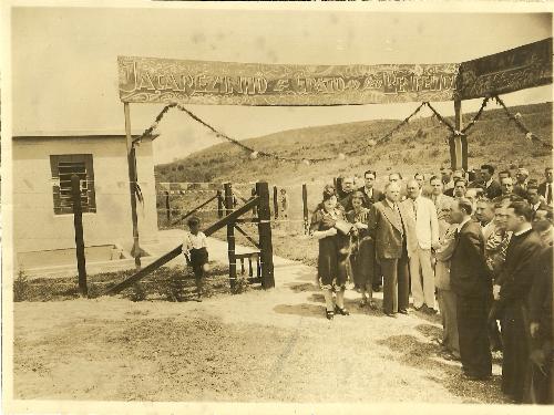 Foi em 16 de setembro de 1939 -mesmo dia da inauguração do Ginásio Rui Barbosa- que foram também inaugurados os serviços de água e esgoto de Jacarezinho. A fotografia é daquele momento e mostra o Interventor Manoel Ribas (de terno escuro, ao lado de outra pessoa de terno branco) com as mãos para trás segurando o chapéu. Depois da pessoa de branco está o Prefeito Benedito Moreira (de terno e gravata). Pouco mais à direita é possível ver parte da cabeça do Dr. João Aguiar. Uma das senhoras parece ser a esposa do Interventor. A placa homenageia o Prefeito e o local parece ser onde se encontra a primeira caixa dágua de Jacarezinho na Rua Apucarana e que no dia da inauguração não contava ainda com a caixa dágua. As demais pessoas não foram identificadas mas é possível ver dois padres no local. No verso da foto está aposto o carimbo do fotógrafo Eurico Krois que tinha então como endereço a Rua Coronel Baptista, 121.