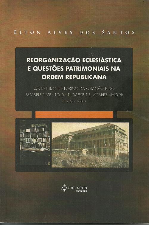 "Reorganização Eclesiástica e Questões Patrimoniais na Ordem Republicana" é a monografia que acaba de ser lançada por Élton Alves dos Santos, Trata-se de obra magnífica que resgata a memória a história da criação da Diocese de Jacarezinho e a sua formação patrmonial, notadamente no período de 1926 a 1940,época em que os dois grandes colégios católicos (Imaculada Conceição e Cristo Rei) se estabeleceram nesta cidade.