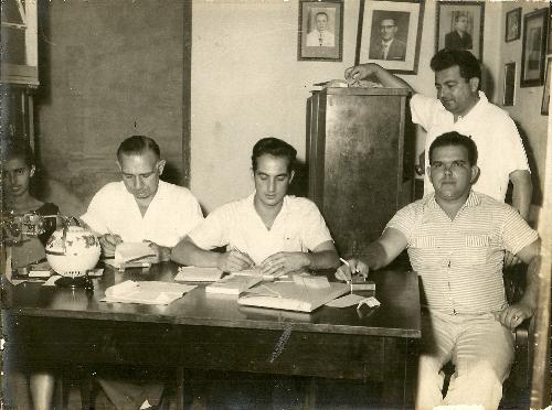 O Jacarezinho Clube, desde sua fundação até alguns anos atrás, foi o ponto de encontro da sociedade local. E assim,pertencer à sua diretoria era também uma honra. Nesta imagem do final da década de 50, quatro diretores do Clube estão em pleno trabalho em sua secretaria. São eles, da esquerda para a direita: Durval Pallezzi, presidente do Clube e empresário (fal.); Neomar Peixoto, professor; Newton Villela, farmacêutico; e em pé, Octacílio Medeiros de Souza, contador (fal.).