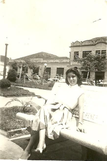 Era o ano de 1953 e a praça Rui Barbosa, então recém inaugurada era o ponto de atração para os jacarezinhenses. Meus pais e seus filhos residiam na esquina da praça e por isso era frequente a nossa presença naquele local. E num dia minha irmã Ângela (fal.) fez a tradicional pose para o fotógrafo, registrando para sempre sua imagem daquele momento. Aos fundos dois prédios ainda hoje existentes, o da esquerda com algumas poucas modificações e o da direita ainda hoje inalterado, sendo ele o mais bonito sobrado de Jacarezinho.