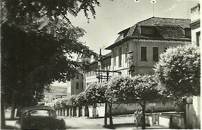 Imagem da Avenida Getúlio Vargas em meados da década de 60, sobressaindo-se neste trecho o prédio do Colégio Cristo Rei. Destaque especial às árvores cuidadosamente podadas e de maneira uniforme.