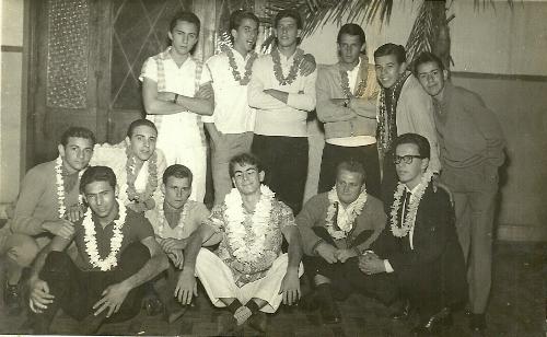 Foto dos anos 60 mostra um grupo de jovens no salão de entrada do Jacarezinho Clube reunido provavelmente antes do início de um baile talvez do Haway.