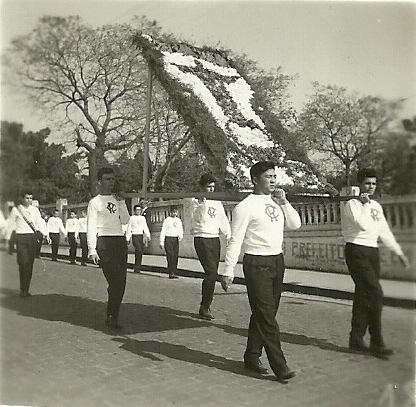 Com um uniforme pouco lembrado por muitos ex-alunos, o Colégio Cristo Rei desfila descendo a rua Paraná em uma imagem de meados dos anos 50. O uniforme, embora bastante bonito, foi utilizado por cerca de 10 anos e depois substituído.