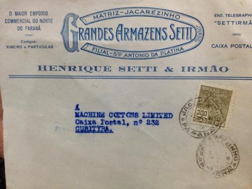 Os irmãos Henrique e Agostinho Setti deram um grande impulso principalmente à firma comercial Casa Setti, com matriz nesta cidade e filiais em várias outras da região. Esta imagem retrata uma correspondência enviada pela empresa, aqui com a denominação de Grandes Armazéns Setti, possivelmente data da década de 30. Observe-se que o selo colado no envelope é do valor de 300 réis; esta moeda foi substituída pelo cruzeiro, que foi implantado em 1º de novembro de 1942. Uma preciosidade, sem dúvida.