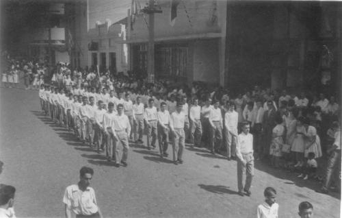 Alunos do Rui Barbosa desfilnam em uma data cívica e à direita alguns estabelecimentos que não mais existem. Na esquina o prédio da Caixa Econômica, hoje, da Justiça Federal. Vindo da esquerda para a direita o Bar e Café Progresso de J.B. Vallin. Em seguida a filial do Banco de São Paulo e aqui, quase na ponta o prédio do Banco Comercial do Paraná, ainda existente e preservado mas que hoje sedia uma empresa comercial. À esquerda o conhecidíssimo Belo (Luiz Liberto, fal.). Imagem do desfile do dia 07 de setembro de 1960.