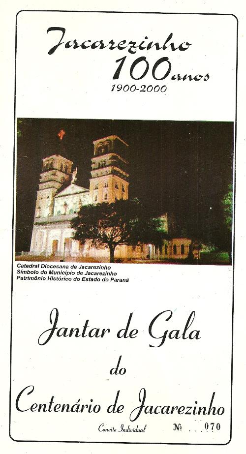 Quando Jacarezinho completou o centenário de sua emancipação política várias solenidades e festividades foram realizadas. Sob a gestão do Prefeito Mário Clóvis Gaspar teve lugar nos salões do Jacarezinho Clube, no dia 31 de março de 2.000 o "Jantar de Gala do Centenário de Jacarezinho" O convite para aquela festa é este que se encontra nesta página e que possivelmente poucos devem ter guardado como recordação do acontecimento. O jantar foi uma das promoções organizadas pela Comissão do Centenário, na qual tive a honra de integrar.