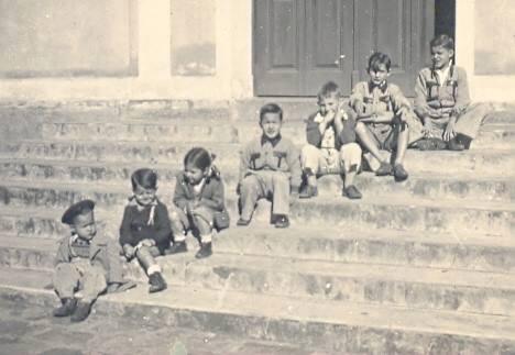 Crianças na escadaria da Igreja de São Benedicto provavelmente participando de alguma atividade religiosa. São elas: Fernandinho Rocha, Júlio César, Cyrene Carnielli, Roberto Rocha, Renato Carnielli, Sidney e José Carlos Rocha. A foto é de 1948.